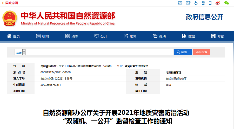 近日,自然資源部辦公廳發(fā)出通知,就做好2021年地質(zhì)災(zāi)害防治活動(dòng)“雙隨機(jī)、一公開”監(jiān)督檢查工作進(jìn)行部署,以進(jìn)一步規(guī)范地質(zhì)災(zāi)害防治活動(dòng),不斷提升地質(zhì)災(zāi)害防治工作質(zhì)量。