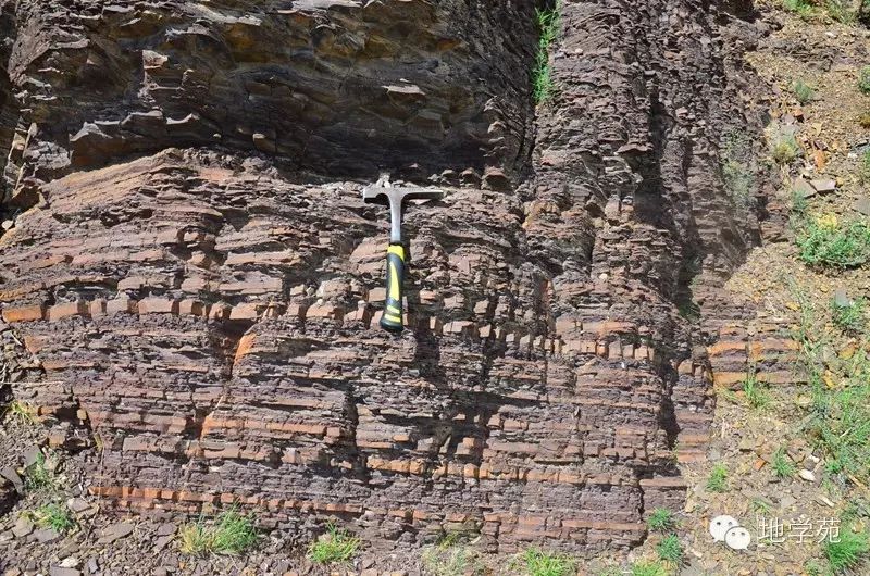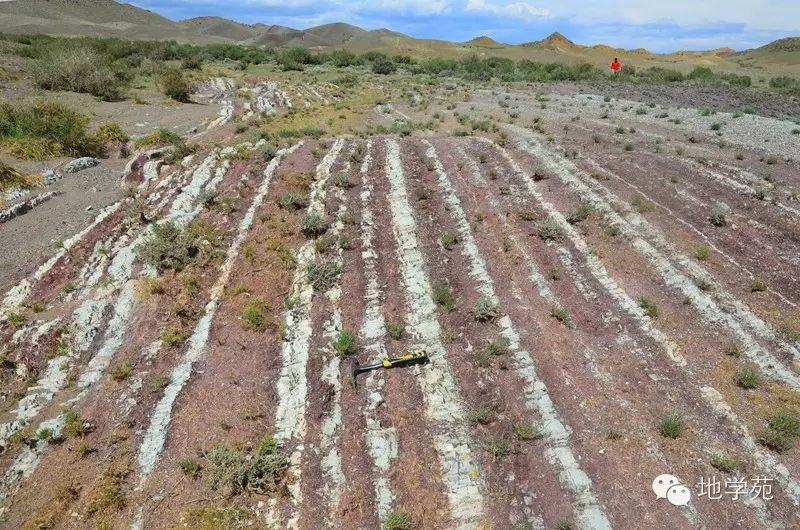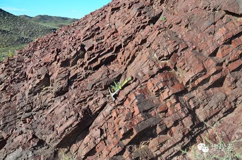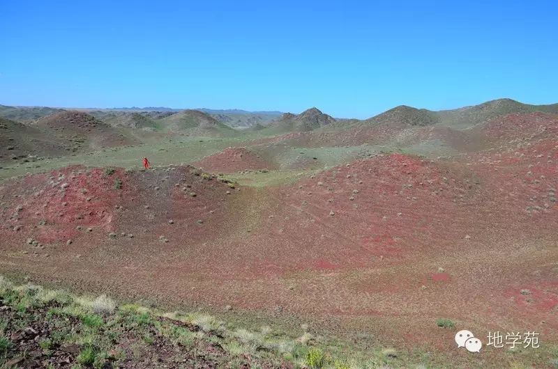 (二)新疆西準(zhǔn)噶爾“紅山”--紫紅色的深海放射蟲硅質(zhì)巖構(gòu)成了山包的主體,遠遠望去像一座座被染紅的山包。