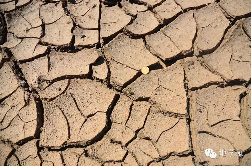 (四)現(xiàn)代沉積物中的泥裂和雨痕,攝于新疆西準(zhǔn)噶爾地區(qū)。