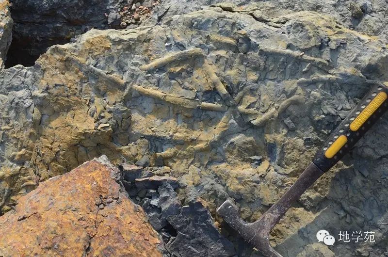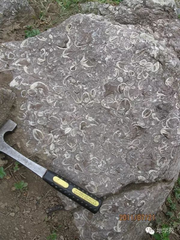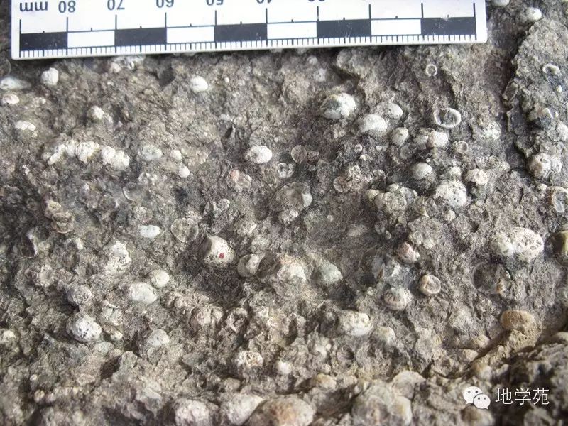(三十六)西準(zhǔn)噶爾中志留世的介殼灰?guī)r,內(nèi)部含豐富的腕足類化石。
