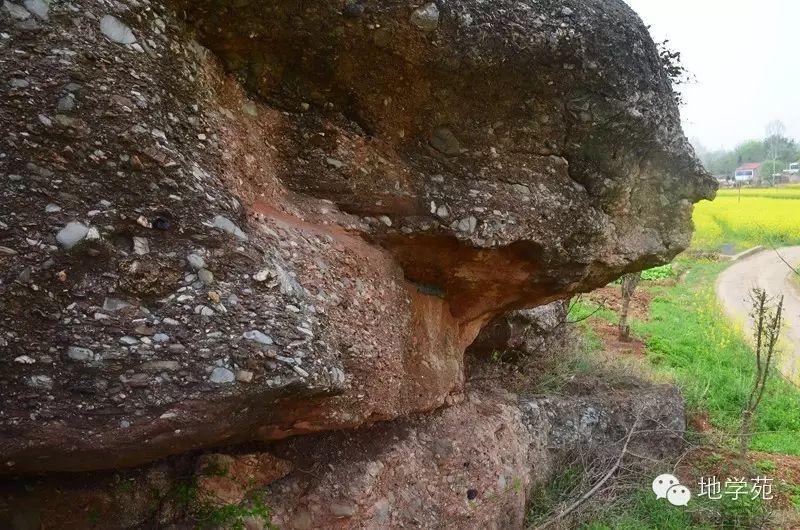 (十九)平行不整合現(xiàn)象--下部灰色的為下志留統(tǒng)墳頭組粉砂巖,上部為上泥盆統(tǒng)五通組石英砂巖,之間存在紅褐色的古風(fēng)化殼和底礫巖,攝于武漢地區(qū)