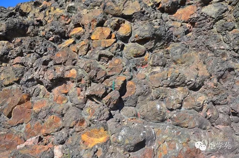 (十)西準(zhǔn)噶爾地區(qū)的枕狀玄武巖,枕間被方解石充填。