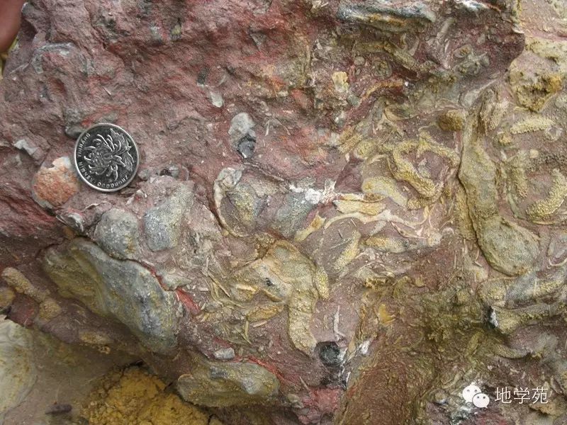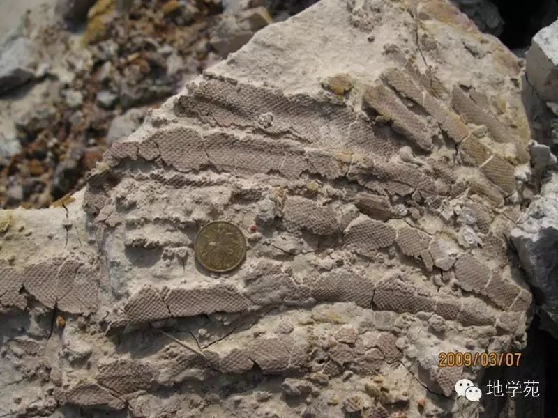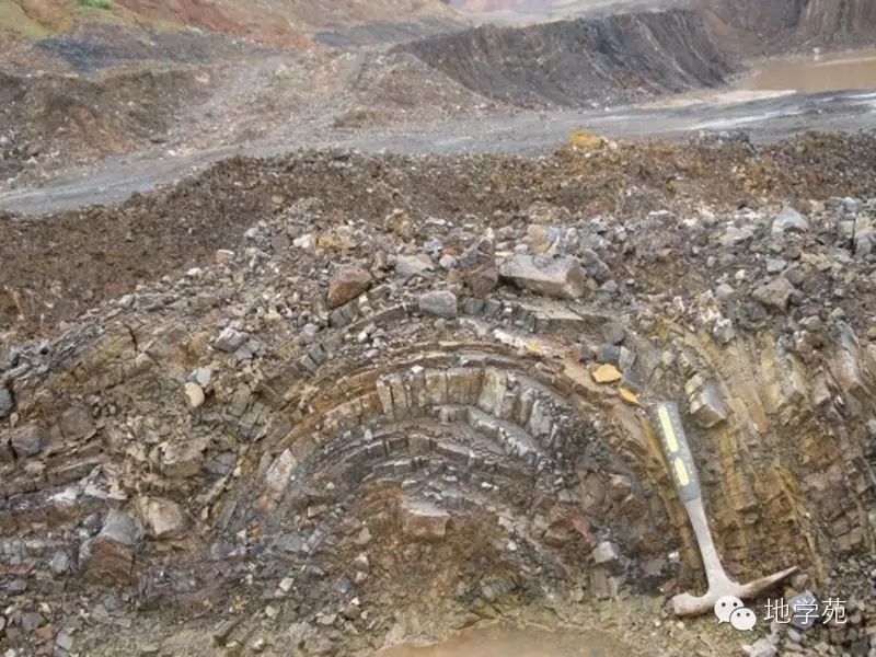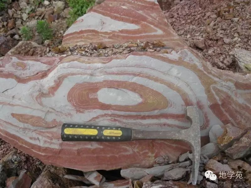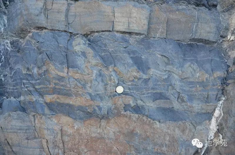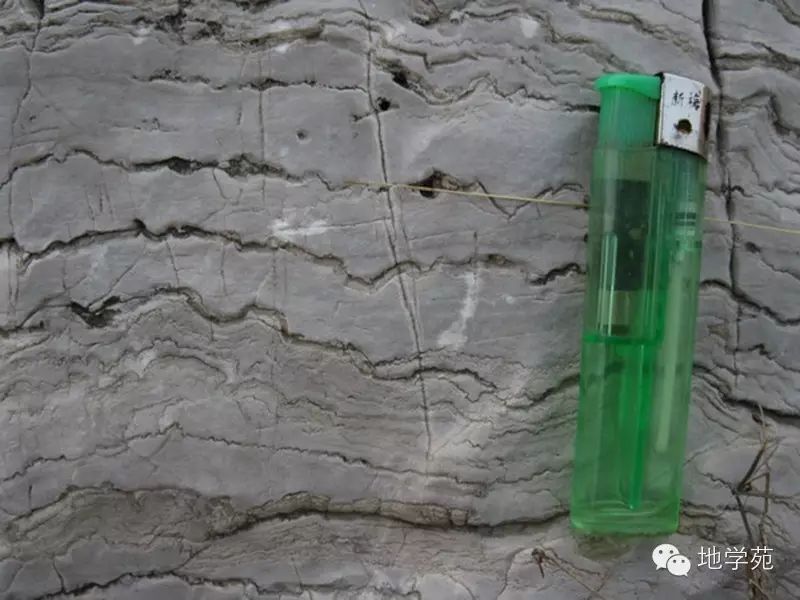 (十五)西準(zhǔn)噶爾地區(qū)上石炭統(tǒng)中的軟沉積變形構(gòu)造,硬幣處巖石層理發(fā)生腸狀扭曲,而上下地層均平整,尚未固結(jié)的沉積物在遭受海底地震或海嘯時,由于失穩(wěn)發(fā)生滑塌而造成。