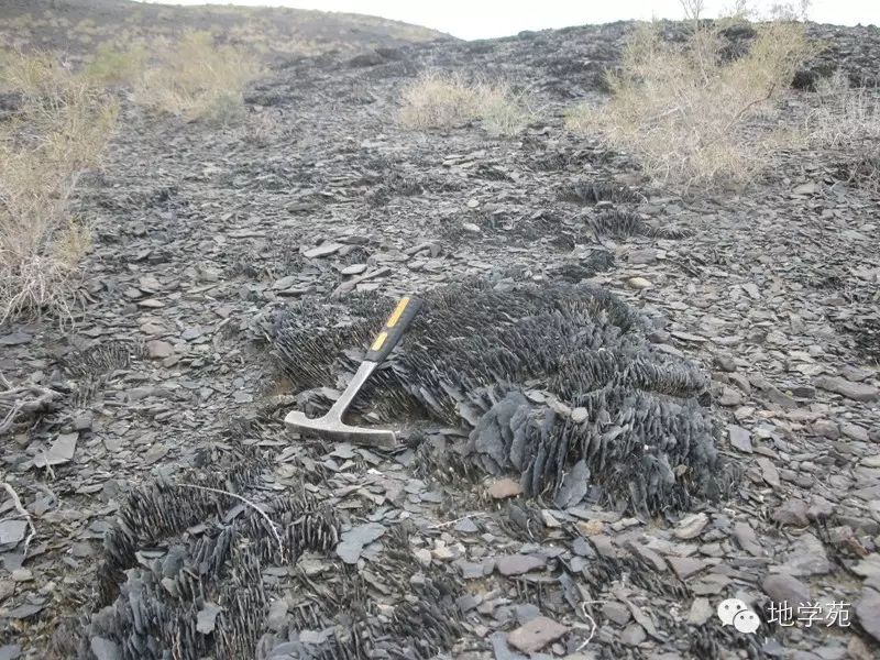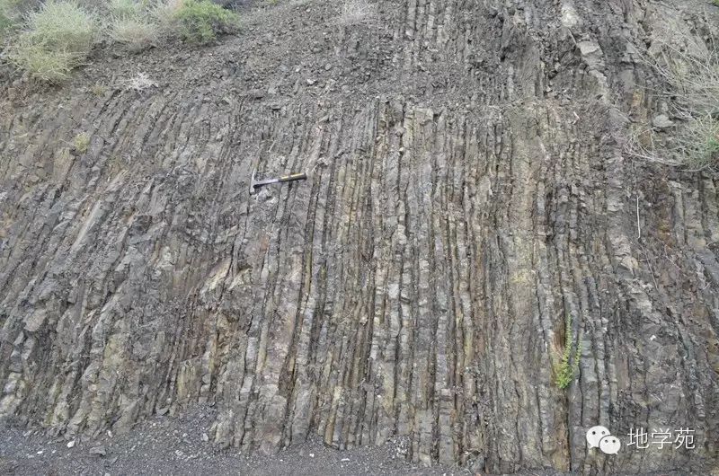 (十七)強烈劈理化的泥質(zhì)粉砂巖,巖石猶如刀片一般,攝于西準(zhǔn)噶爾地區(qū)。