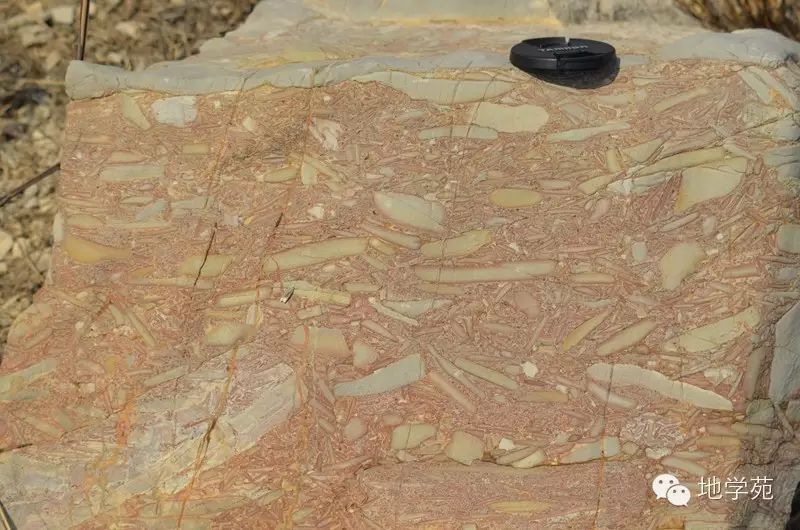 (十四)安徽北部上寒武統(tǒng)炒米店組中的竹葉狀灰?guī)r,上為斷面,下為層面,為尚未固結(jié)的灰?guī)r軟泥遭受風(fēng)暴打碎,再沉積形成。