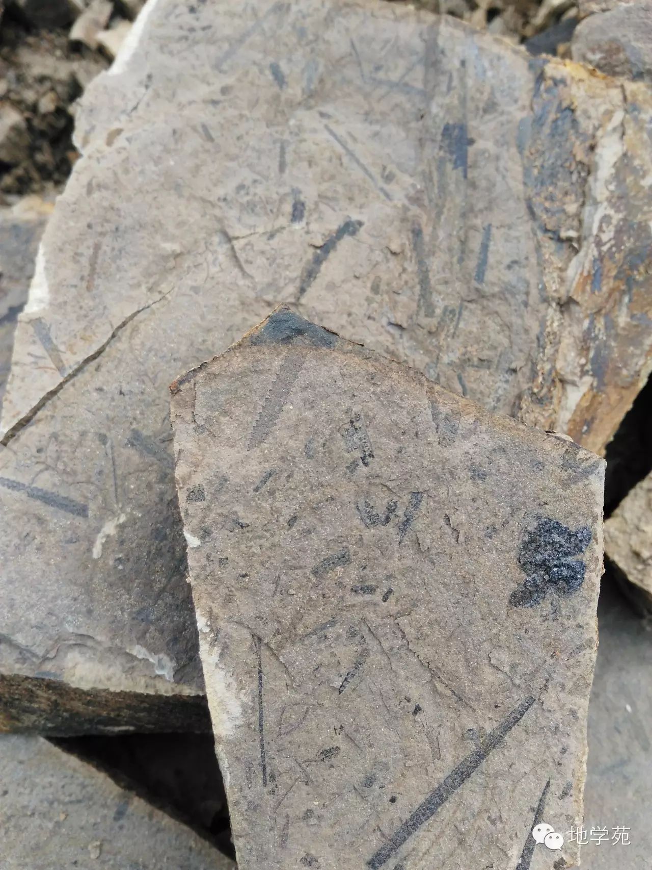 (二十四)三峽地區(qū)早志留世的筆石相頁巖,表面密密麻麻的全是筆石化石,代表了水體寧靜、滯留的深水環(huán)境。