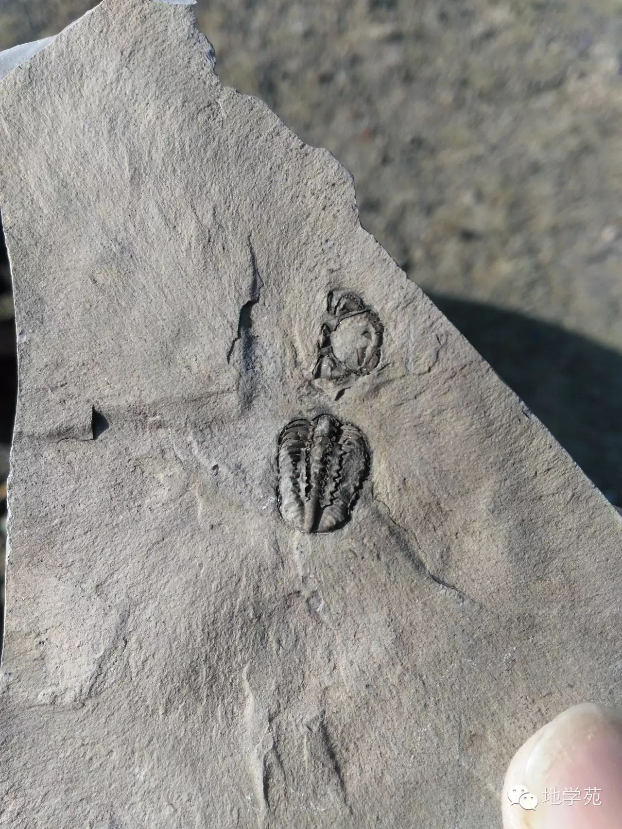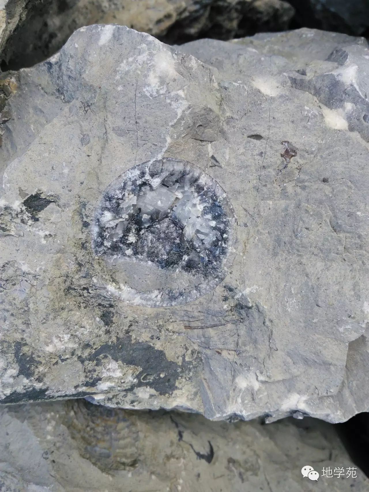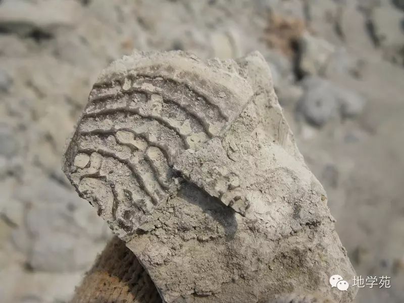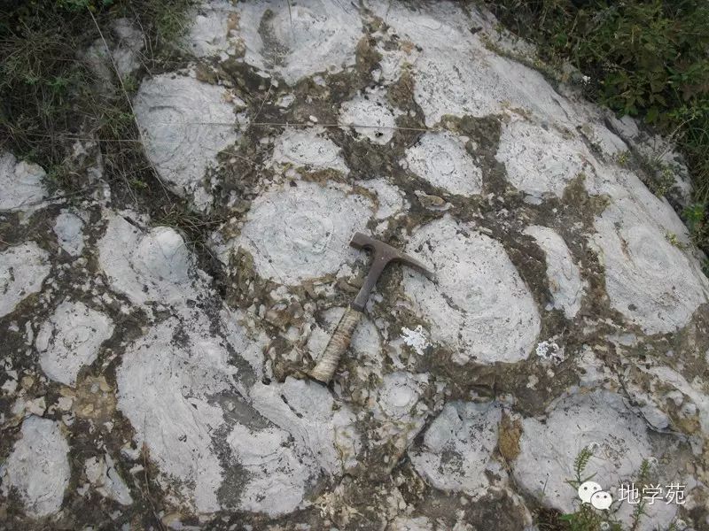 (二十五)三峽地區(qū)奧陶紀(jì)灰?guī)r中的角石橫截面,比較有意思的是橫截面下部被沉積物充填,上部是重結(jié)晶的方解石,在地層中可以用來判斷地層的頂?shù)酌?,有方解石的部分代表?dāng)時殼體中的空洞,在后期成巖中被碳酸鈣溶液滲入重結(jié)晶形成的,因此有方解石的一側(cè)代表了地層的頂面。