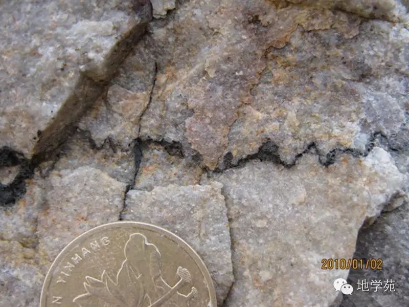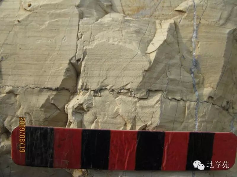 (三)河北秦皇島新元古代龍山組石英砂巖中發(fā)育的小型正斷層,左側(cè)的斷層上盤相對下降。