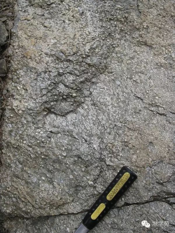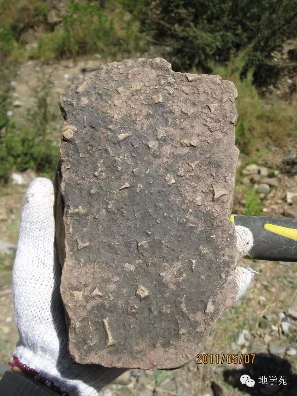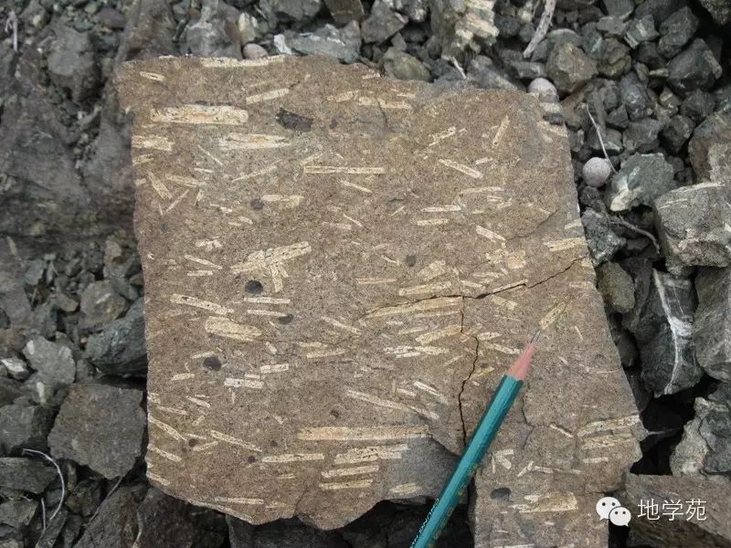 (五十七)西準(zhǔn)噶爾晚石炭世的安山玢巖,白色巨大的斑晶為斜長石。