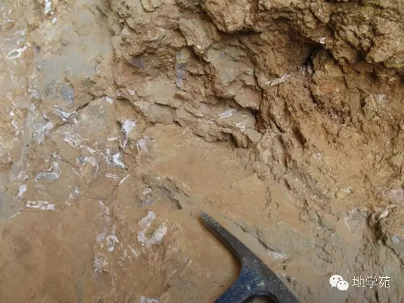 (四十八)安徽北部含哺乳動物化石(白色部分)的新生代洞穴堆積物。