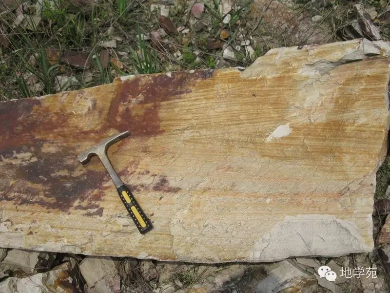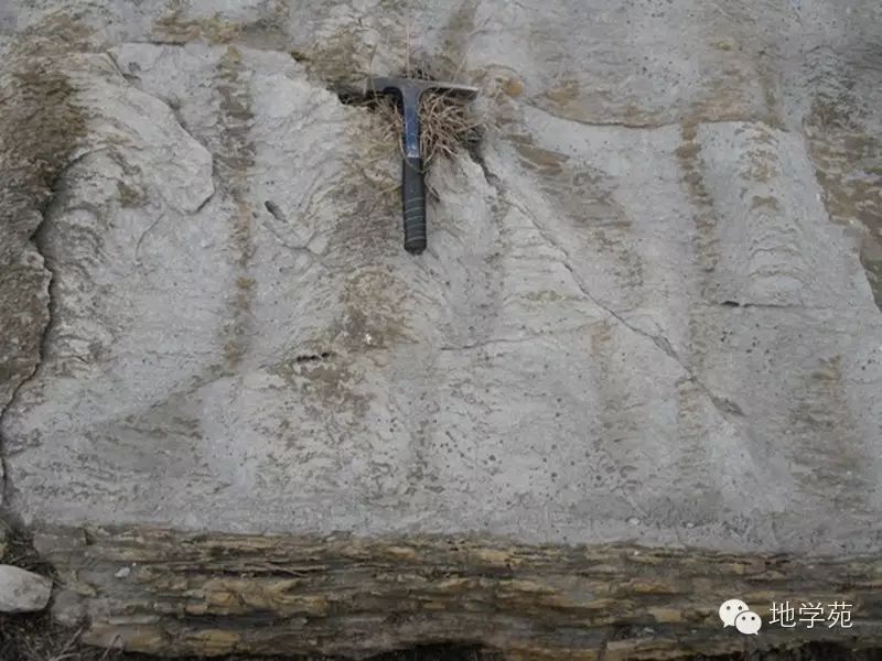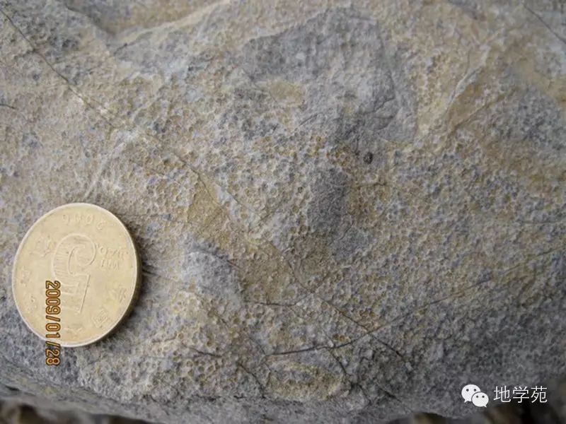 (十二)安徽北部上寒武統(tǒng)三山子組的白云巖,表面發(fā)育刀砍紋構(gòu)造,風(fēng)化面呈砂糖狀,很像砂巖。