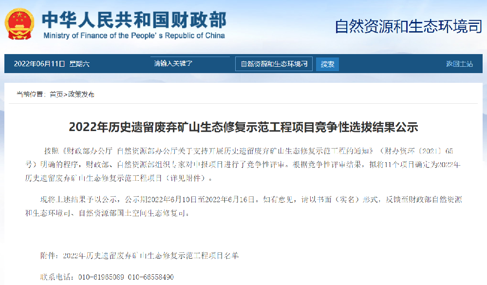 一、2022年歷史遺留廢棄礦山生態(tài)修復(fù)示范工程項目2022年歷史遺留廢棄礦山生態(tài)修復(fù)示范工程項目競爭性選拔結(jié)果公示按照《財政部辦公廳 自然資源部辦公廳關(guān)于支持開展歷史遺留廢棄礦山生態(tài)修復(fù)示范工程的通知》(財辦資環(huán)〔2021〕65號)明確的程序,財政部、自然資源部組織專家對申報項目進(jìn)行了競爭性評審。根據(jù)競爭性評審結(jié)果...