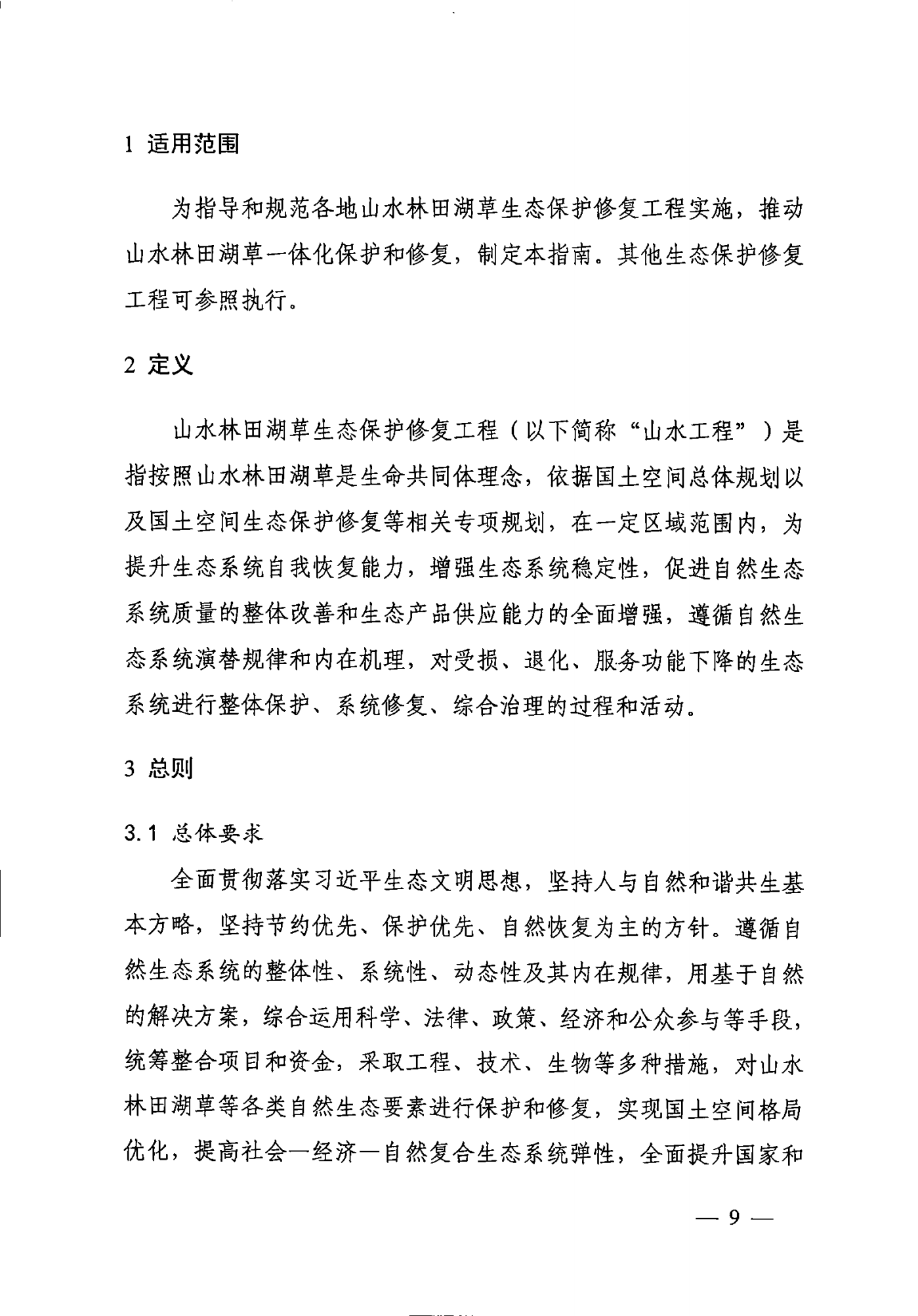 為貫徹落實(shí)黨中央、國(guó)務(wù)院關(guān)于統(tǒng)籌推進(jìn)山水林田湖草一體化保護(hù)和修復(fù)的部署要求,指導(dǎo)和規(guī)范各地山水林田湖草生態(tài)保護(hù)修復(fù)工程實(shí)施,自然資源部、財(cái)政部、生態(tài)環(huán)境部研究制定了《山水林田湖草生態(tài)保護(hù)修復(fù)工程指南(試行)》?,F(xiàn)予印發(fā),請(qǐng)結(jié)合實(shí)際做好相關(guān)工作,推動(dòng)山水林田湖草整體保護(hù)、系統(tǒng)修復(fù)、綜合治理。