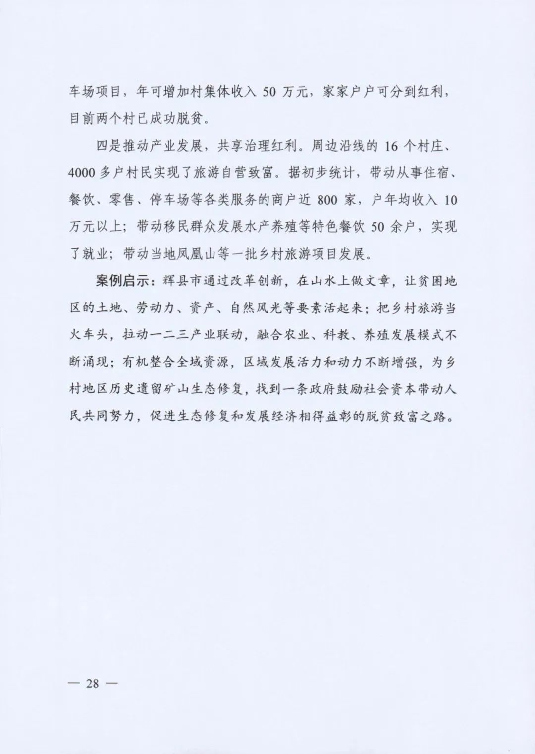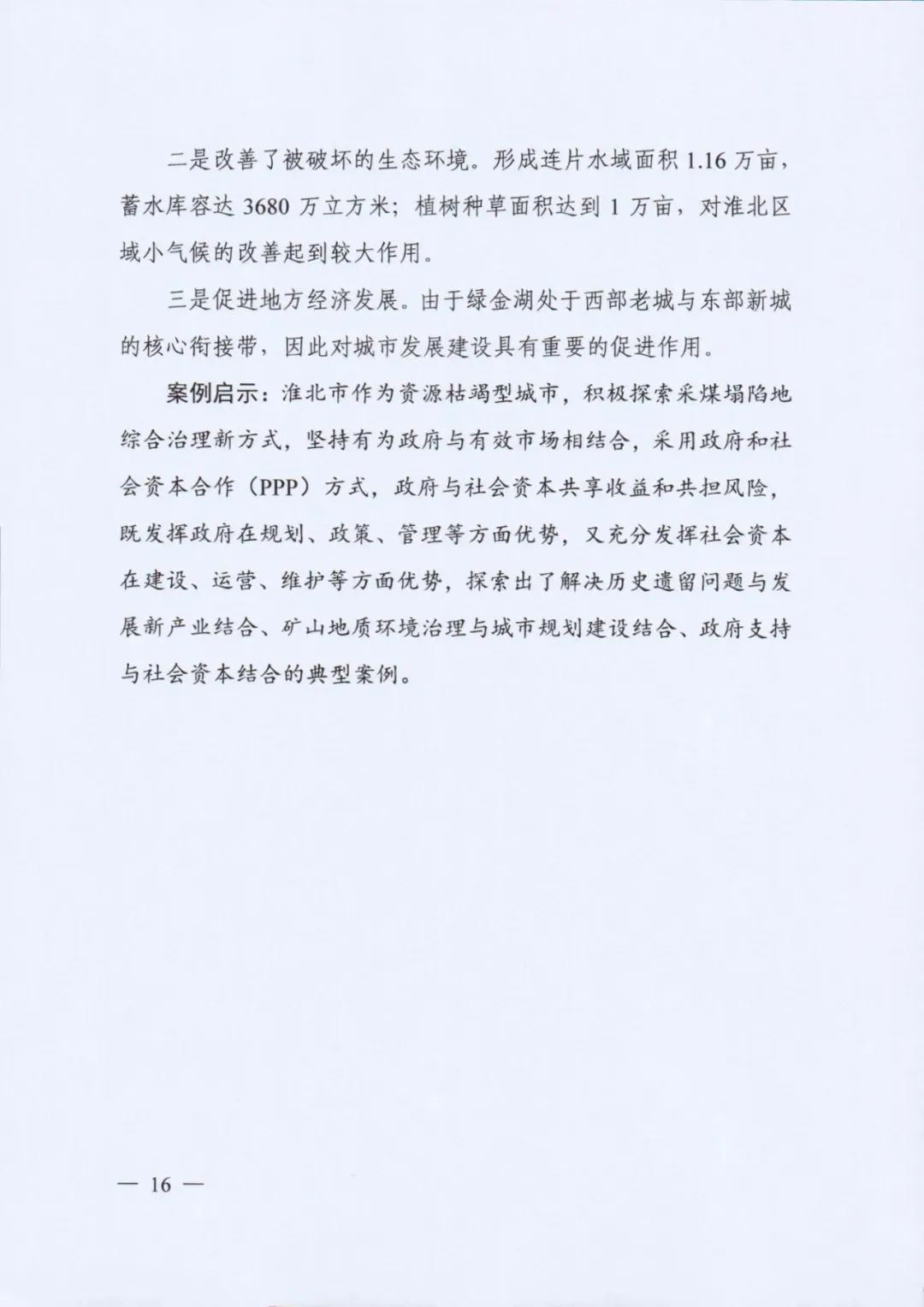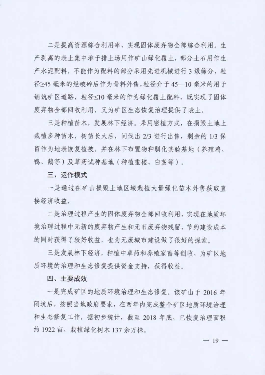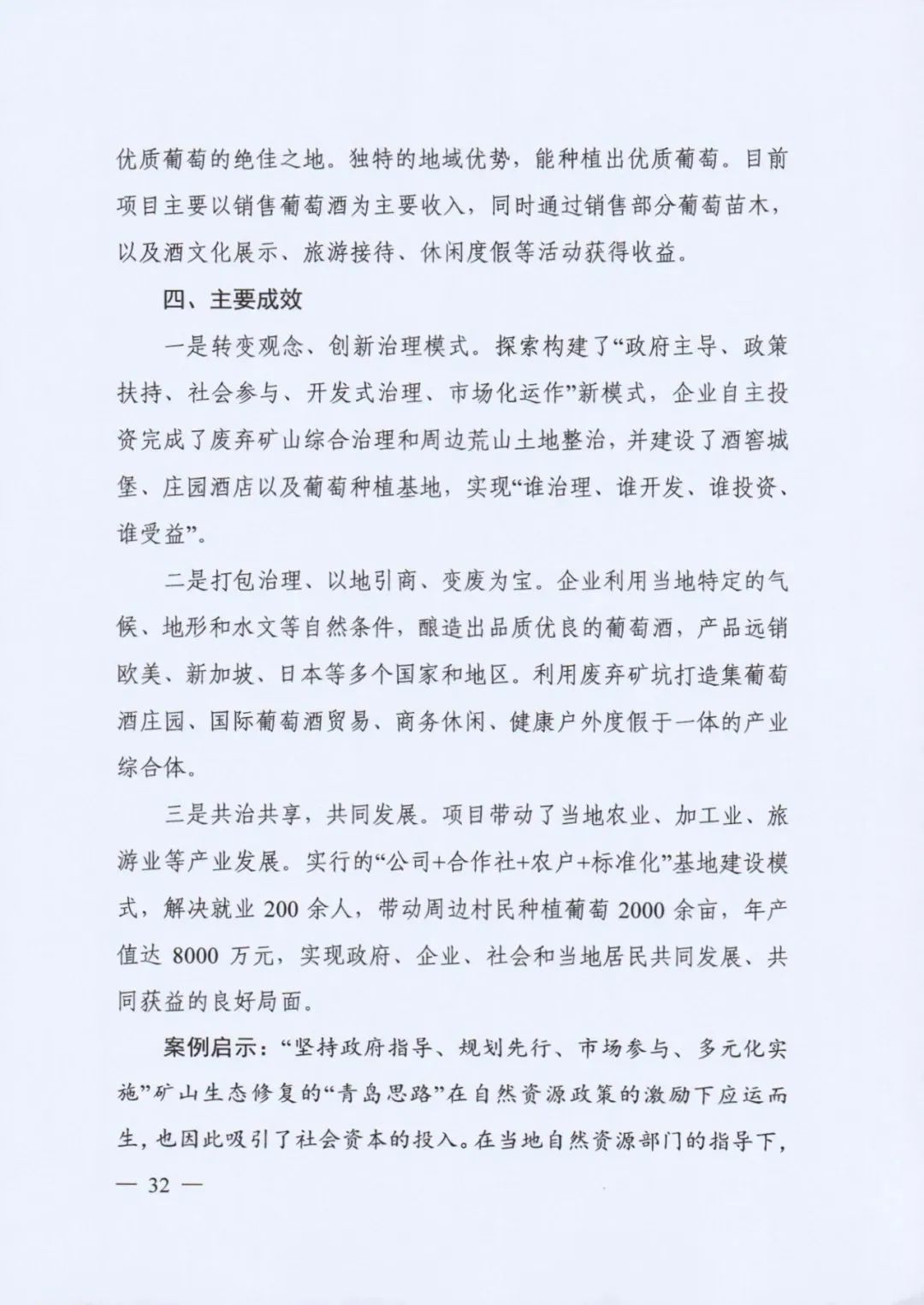 《案例》收集了社會(huì)資本參與礦山生態(tài)修復(fù)、山水林田湖草生態(tài)保護(hù)修復(fù)、土地綜合整治和海洋生態(tài)保護(hù)修復(fù)四種類(lèi)型共10個(gè)案例,重點(diǎn)介紹主要做法、運(yùn)作模式和實(shí)際效果。10個(gè)案例中,包括以生態(tài)修復(fù)改善生態(tài)環(huán)境帶動(dòng)社會(huì)資本投資、政府和社會(huì)資本合作共建、生態(tài)修復(fù)與城市建設(shè)發(fā)展結(jié)合、生態(tài)修復(fù)與脫貧攻堅(jiān)融合、生態(tài)修復(fù)帶動(dòng)旅游業(yè)發(fā)展等生態(tài)保護(hù)修復(fù)的模式,發(fā)揮了良好的生態(tài)效益、經(jīng)濟(jì)效益和社會(huì)效益。